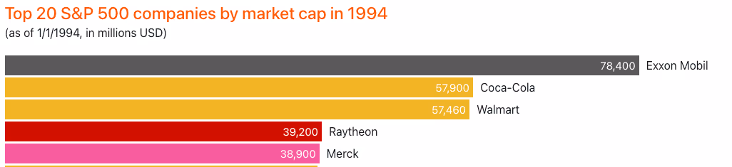 In 1994 the top 5 biggest companies are Exxon, Coca-Cola, Walmart, Raytheon and Merck; organisations working in Oil, FMCG, Grocery, Defence, and Pharmaceuticals.