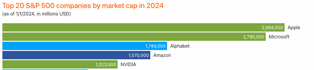 In 2024 they are Apple, Microsoft, Alphabet, Amazon and Nvidia.
