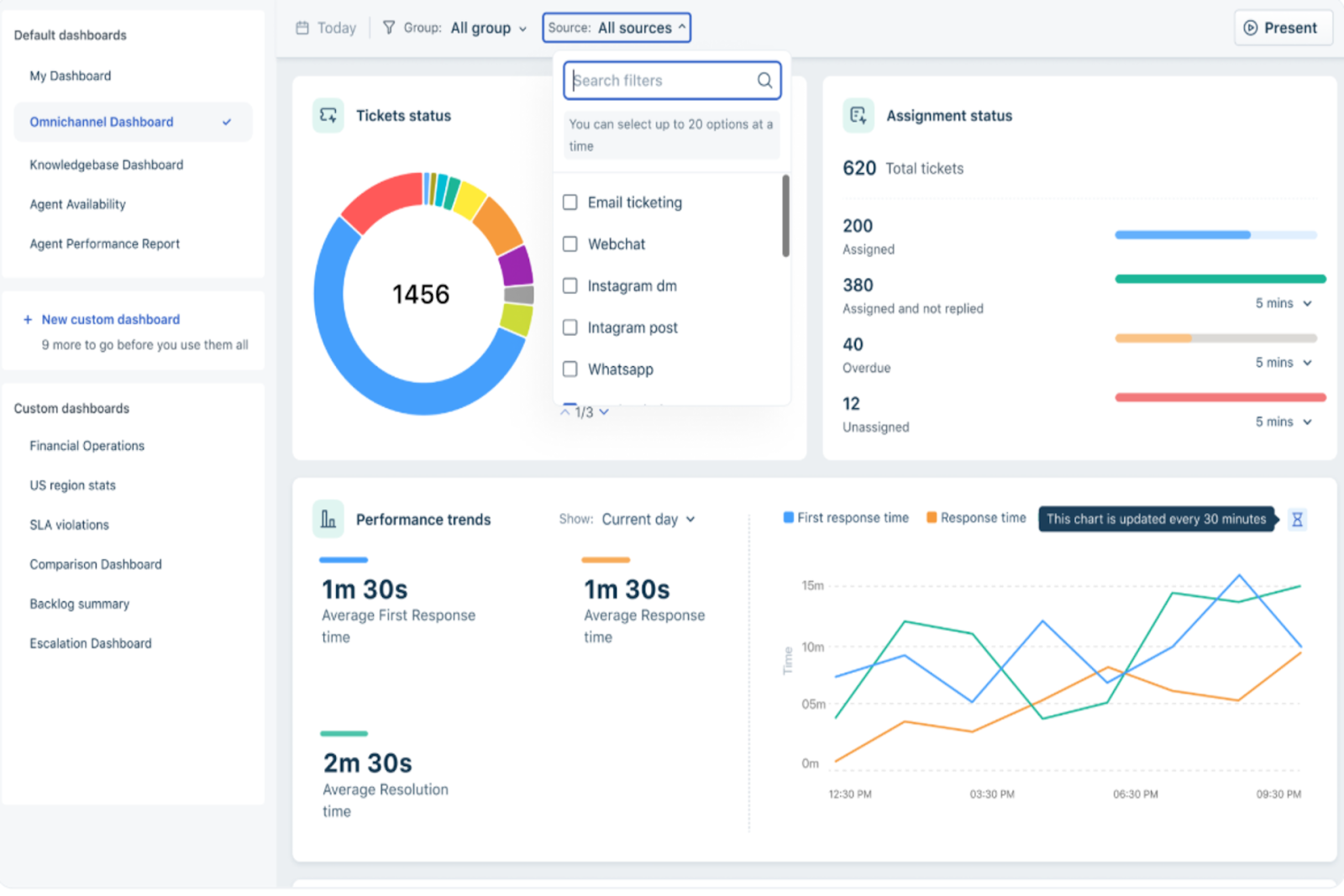 - Ticket Analytics: Combines CSAT, ticket volume, and resolution time in one view