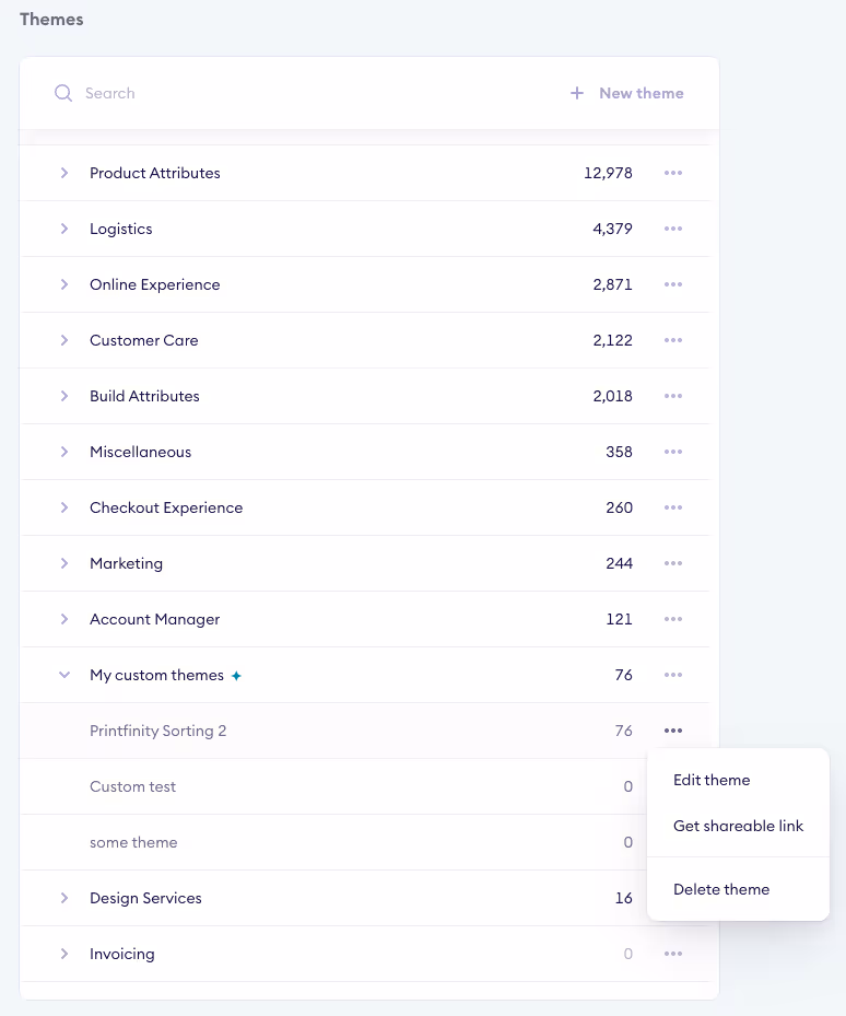 From now on, you can also add Custom Themes to your existing theme structure, ensuring we're not missing the topics that are important to you. You can add, edit, or delete your new themes or contact our support team to make the analysis more accurate and relevant.