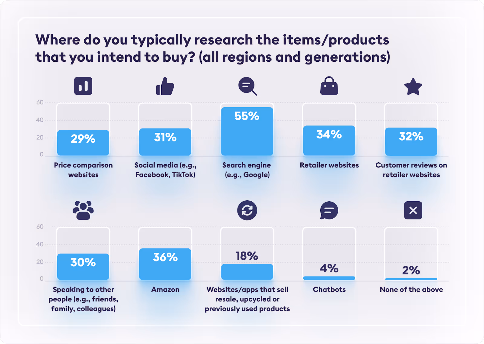 According to the PwC June 2023 Global Consumer Insights Pulse Survey, 32% of global consumers use reviews on retailer websites when researching products they intend to buy. In addition, 36% say they research products on Amazon that have reviews on every product page.
