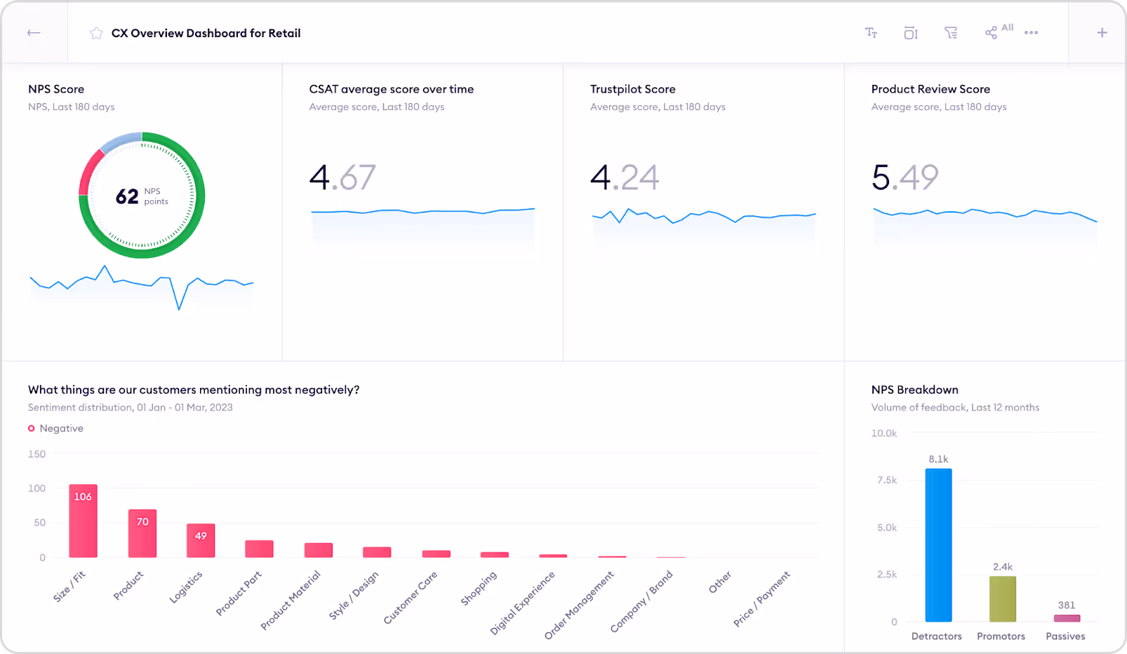 Using VoC tools enhances a retailer’s ability to make strategic decisions based on customer feedback about their experiences and expectations with a brand’s products or services. Having VoC data visualized on a dashboard that can be regularly monitored shows the impact your changes are making and builds confidence in the value of your CX program.