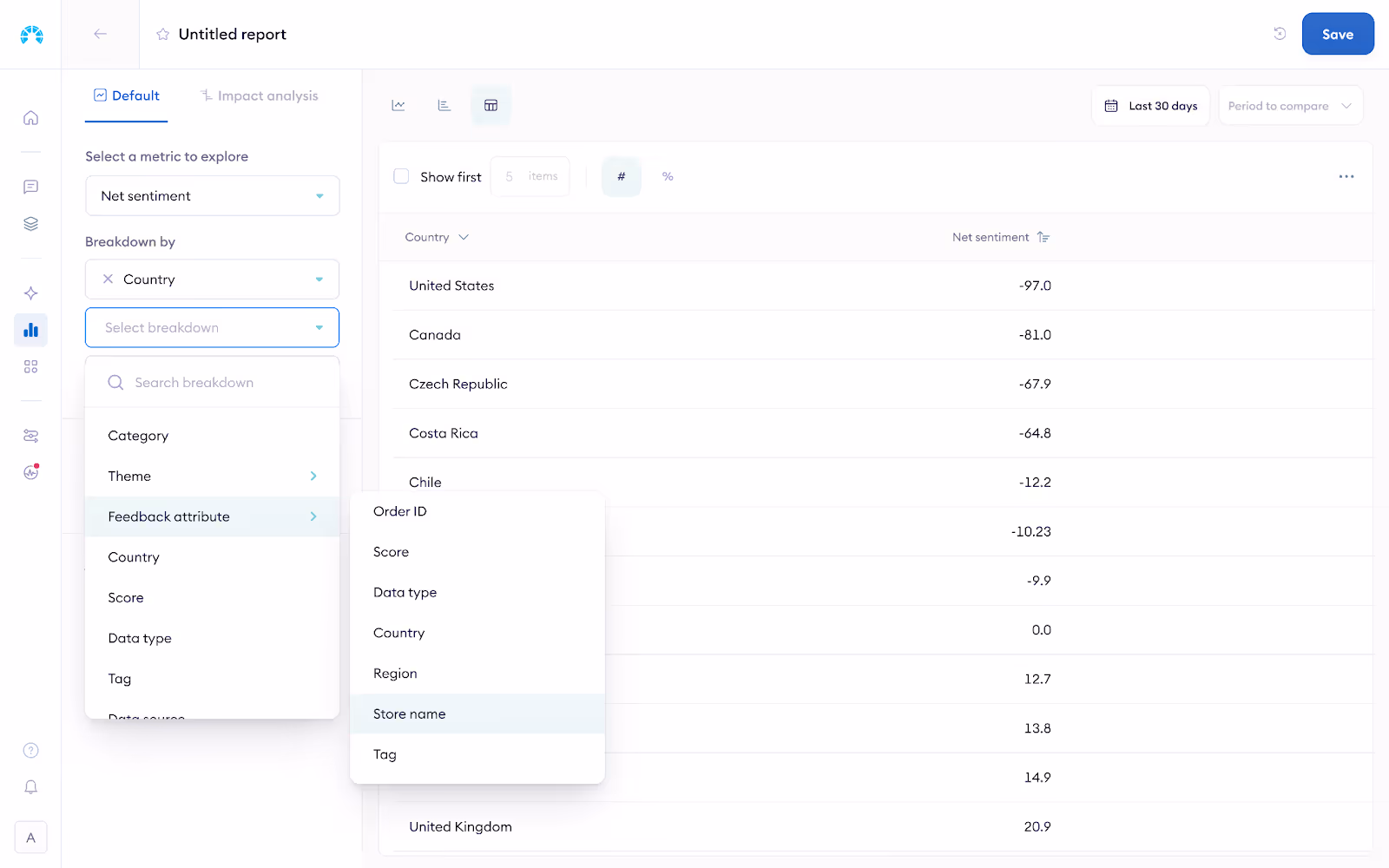 With multiple breakdowns, you can add a second breakdown to focus on specific stores within each region. The new table view now shows both breakdowns within one another, so you can easily compare how individual factors are performing relative to their wider whole, all at a glance. By doing this, you might discover that one or two outlier stores in the Midwest are significantly dragging down the region’s overall net sentiment. These stores may have recurring issues—perhaps long wait times or frequent products that are out of stock —that are negatively affecting the customer experience.