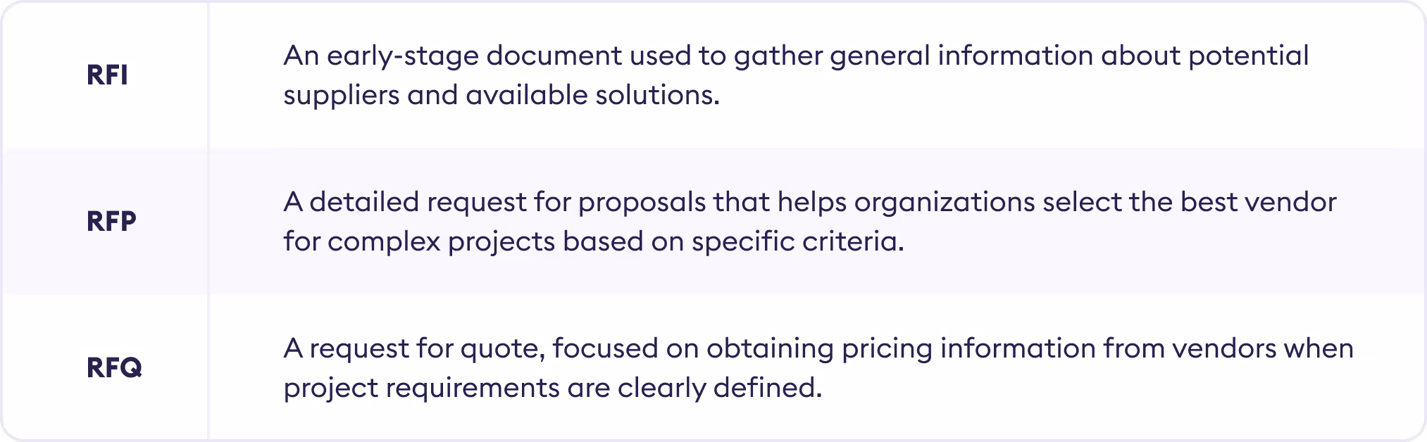 With so many acronyms floating around, it’s easy to get confused - so before we proceed, let’s clarify the difference between an RFP, RFI, and RFQ.