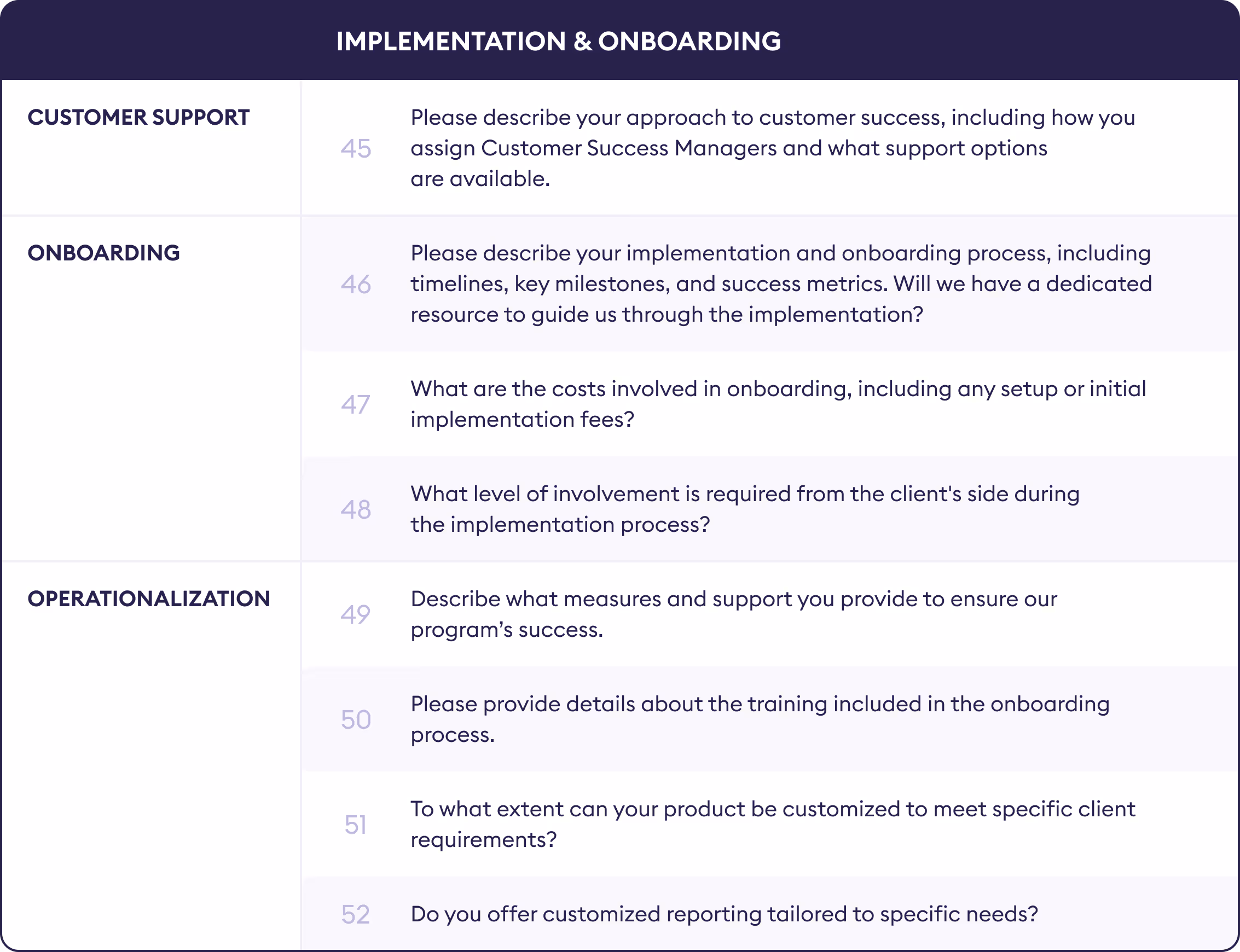 When assessing potential providers, ask about their onboarding process - how quickly your team can start using the platform, how long full setup takes, and whether onboarding is included or comes at an additional cost. Make sure to clarify how much time and internal effort will be required from your side.