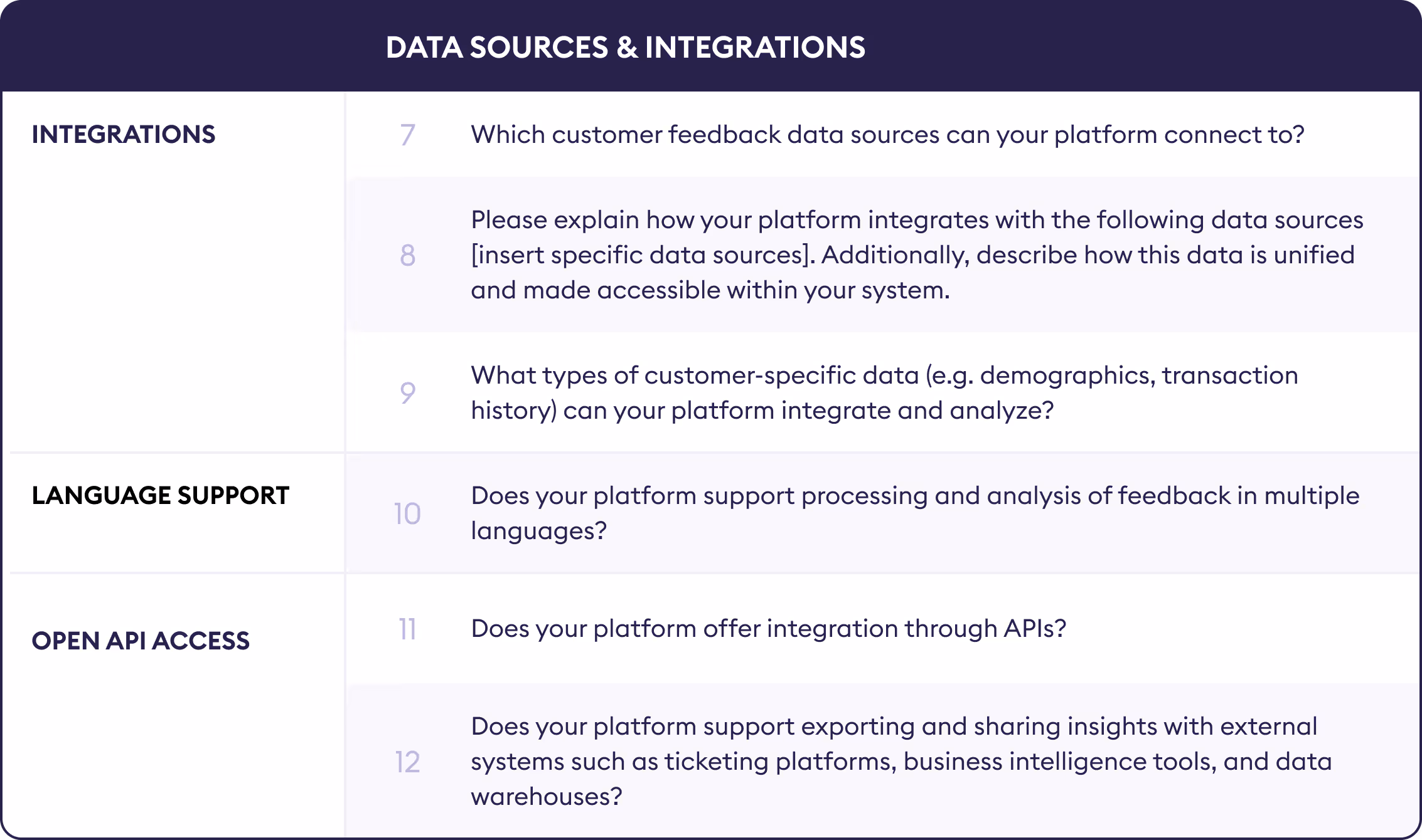 When creating an RFP for a Customer Experience Intelligence or Feedback Analytics platform, it’s important to define clear, objective evaluation criteria. These should reflect your team’s goals and long-term priorities, helping you choose a solution that delivers lasting value and reduces the risk of costly vendor changes down the line.