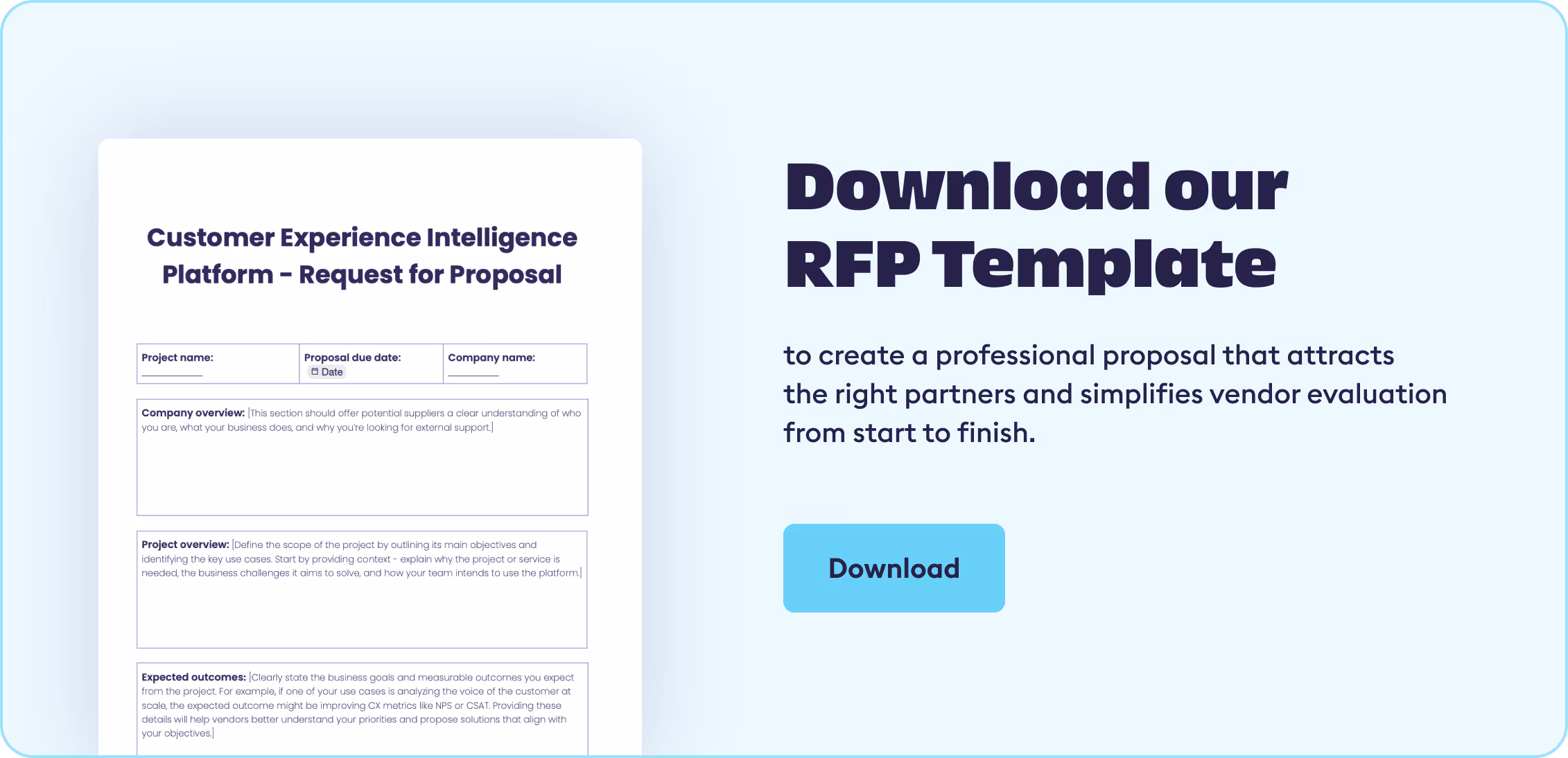 This comprehensive RFP template is designed specifically for choosing the right Customer Experience Intelligence platform, offering a clear structure for potential vendors to follow. It includes sections for project objectives, deliverables, evaluation criteria, and submission requirements - helping you streamline the selection process.