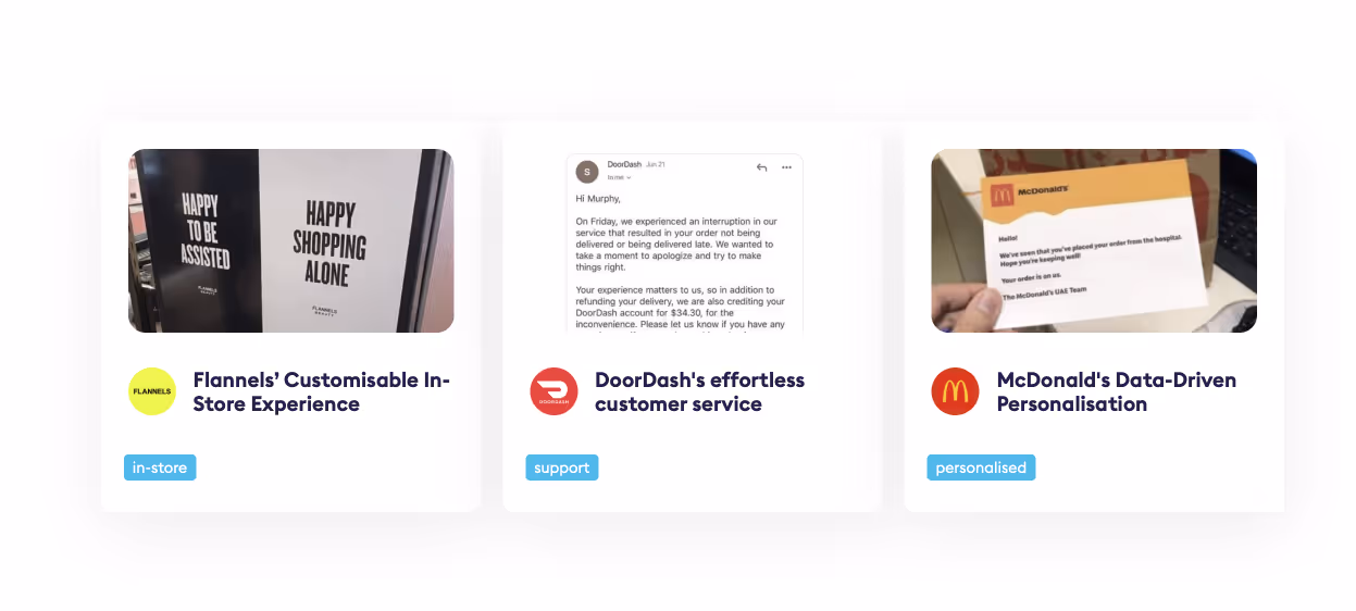 Easily filter through examples with the search bar for a brand you have in mind. And use tags to quickly limit your view to the areas that matter most to you: support, web design, packaging, in-store, returns, or personalised CX. With these filter options, you can focus on the examples most relevant to your brand.