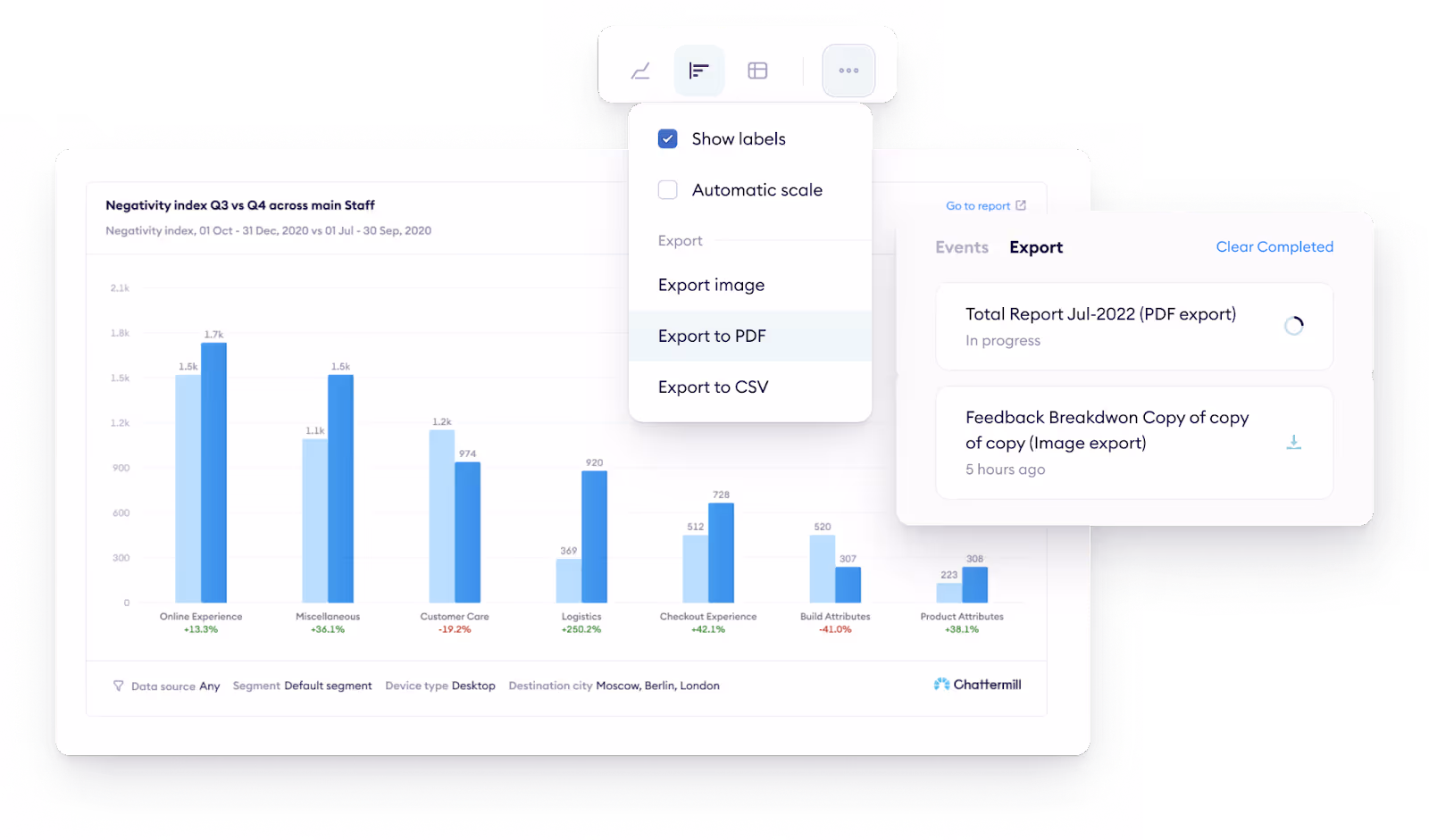 That's why you can now easily download reports from Chattermill in a PDF or PNG format with a click of a button.