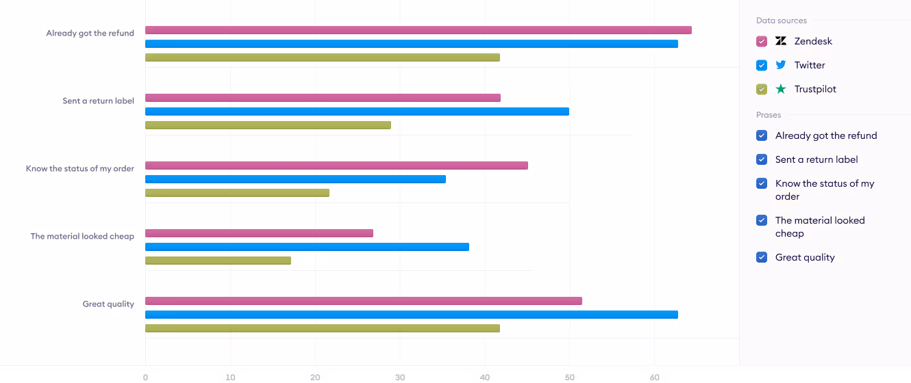Seeing critical issues reported in your support tickets and conversations with other channels also unlocks more comparison and benchmarking options, as companies can now investigate and validate the size or impact of the problem across multiple customer touchpoints.