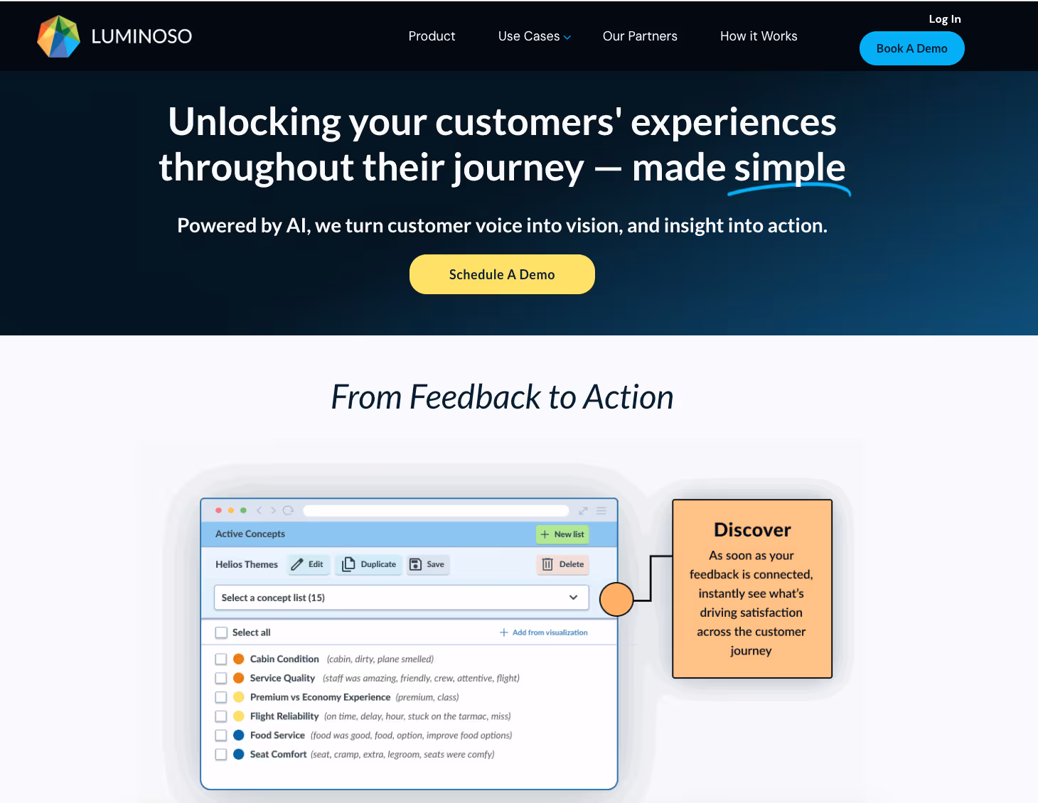 Luminoso is a text analytics platform that uses unsupervised machine learning to understand customer feedback without requiring pre-defined categories or training data. The platform's AI learns the meaning and relationships between concepts directly from your text data, making it particularly effective when analyzing feedback with evolving language and terminology.