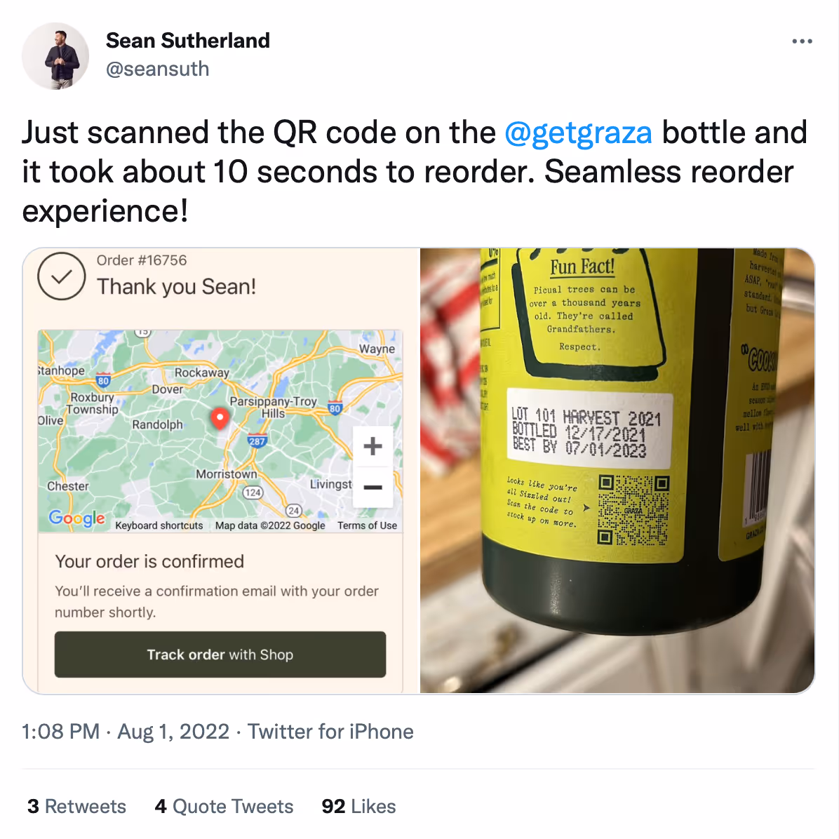 We really love this one. Through the use of a simple QR code, Graza Olive Oil has made reordering its products a breeze.