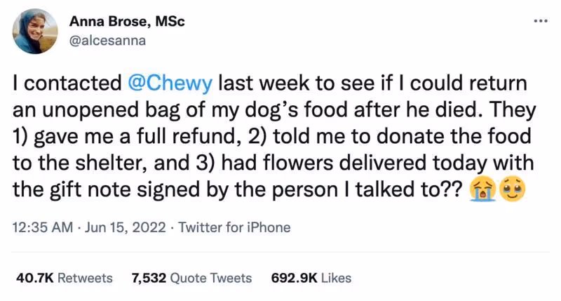 This customer requested a return on dog food after their dog passed away. Chewy, a pet supplies giant, promptly issued a full refund, an altruistic suggestion of how to donate the food, and finished off with a personal touch: a handwritten note accompanying flowers.