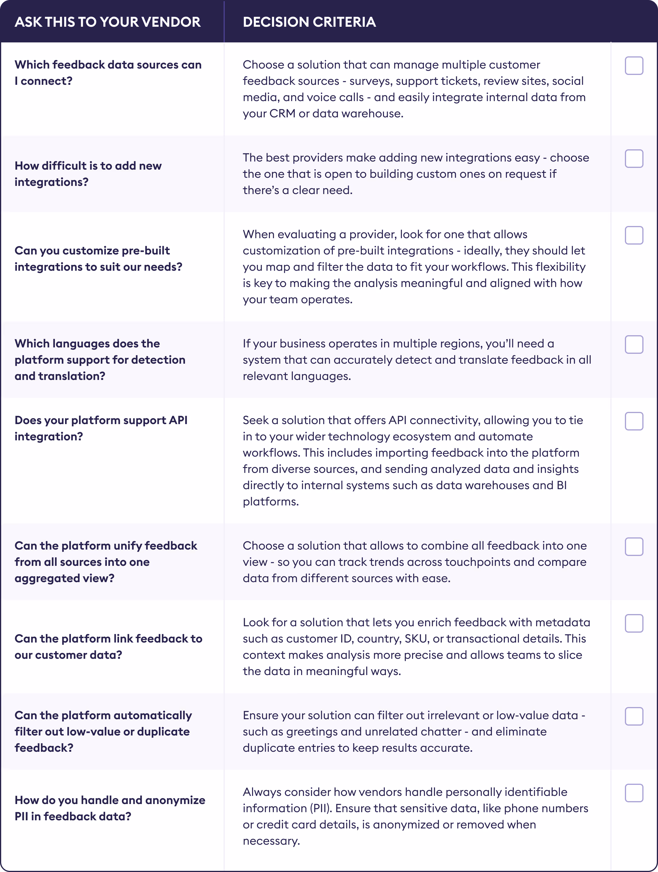 Choose a provider who truly understands your feedback challenges and can help improve your data collection process. They should be able to conduct touchpoint gaps analysis, assist in designing effective surveys, and ensure the data you gather is accurate, comprehensive, and aligned with your key business goals.