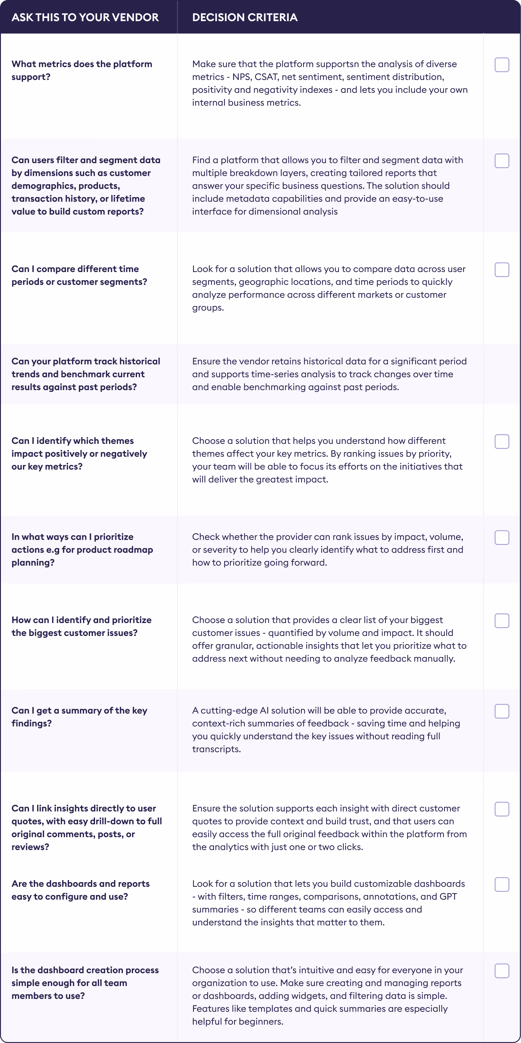 Ensure your vendor offers the expertise and product capabilities needed to support key use cases such as NPS analysis, product returns, retention, product feedback, and share of wallet. This should include custom dashboards, reports, and alerts tailored to each use case.