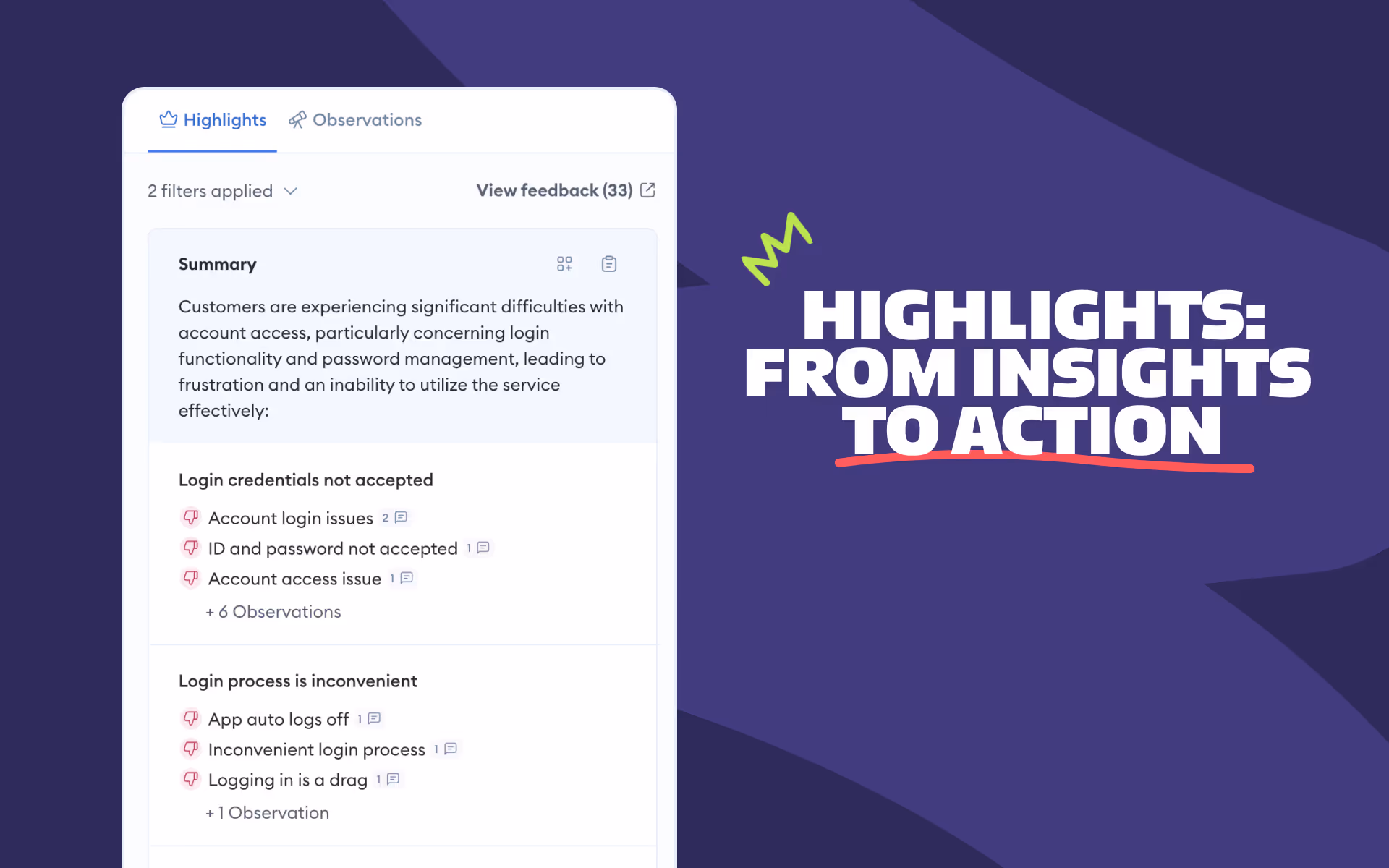 - Highlights take these insights further by identifying key takeaways, with each finding traced back to verified customer quotes.