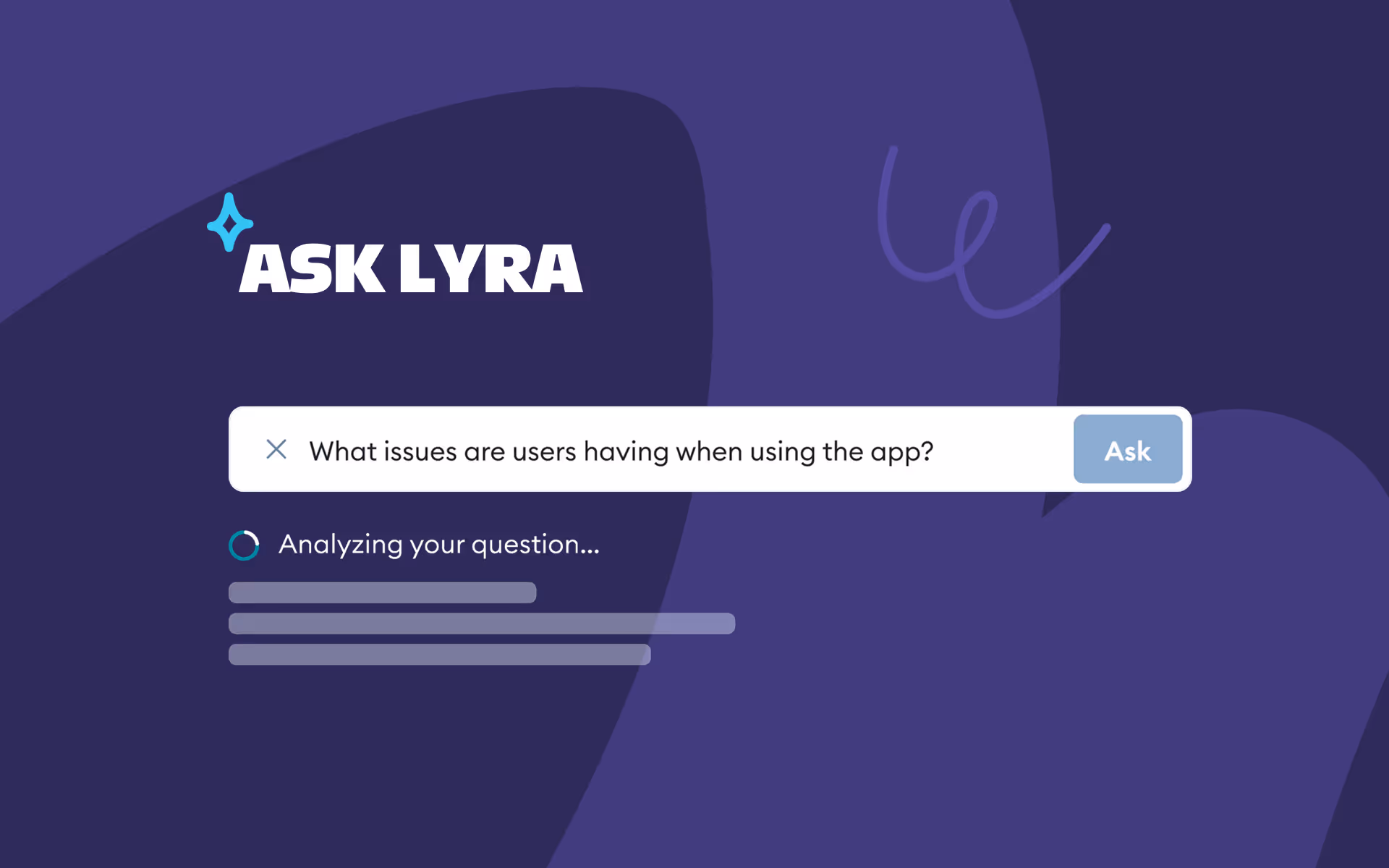 Ask Lyra bridges that gap by turning your questions into instant, data-backed answers. It's your copilot for customer insights - the front door to understanding your customer feedback. Simply ask in plain English and get comprehensive responses grounded in your actual data.