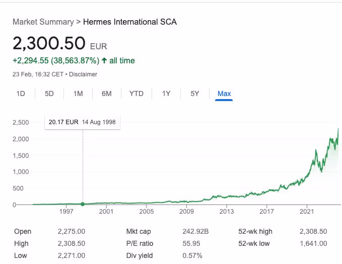 Hermes is over 180 years old, but it is still doing very well, with the share price increasing 4x over the last five years at the time I’m writing this and 39x since its listing in the 90s.