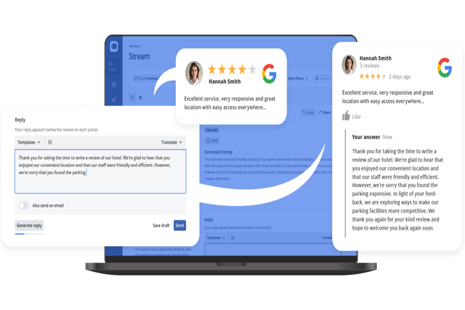 - Aggregated analytics across Google, Trustpilot, and major review platforms, and sentiment tracking