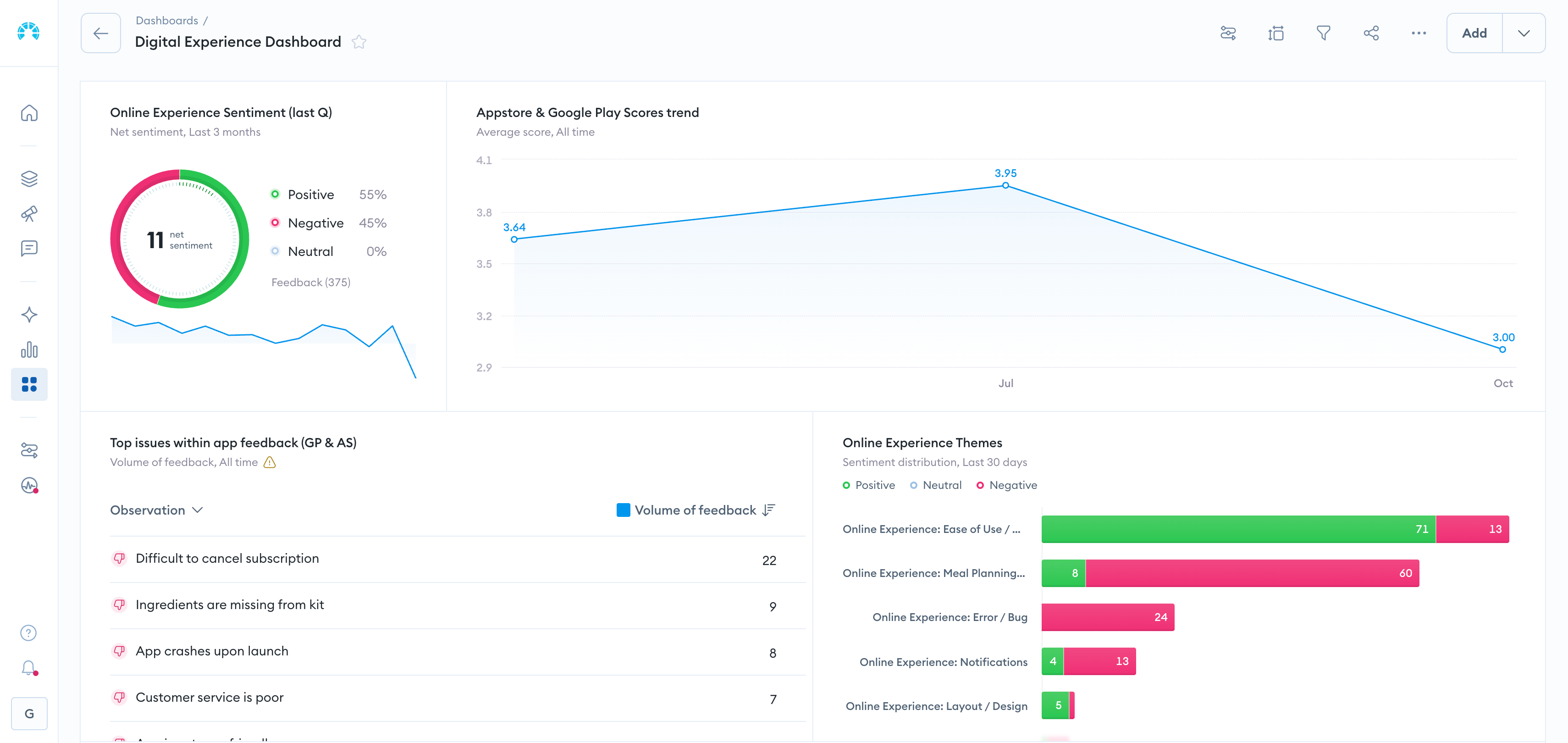 Medallia is an enterprise CX and employee experience platform built around real-time signal capture. It ingests feedback from digital, physical, and operational touchpoints and routes insights to role-specific dashboards for frontline teams and executives. Widely deployed in regulated industries, Medallia is particularly strong for organizations that need closed-loop workflows and real-time alerting at scale.