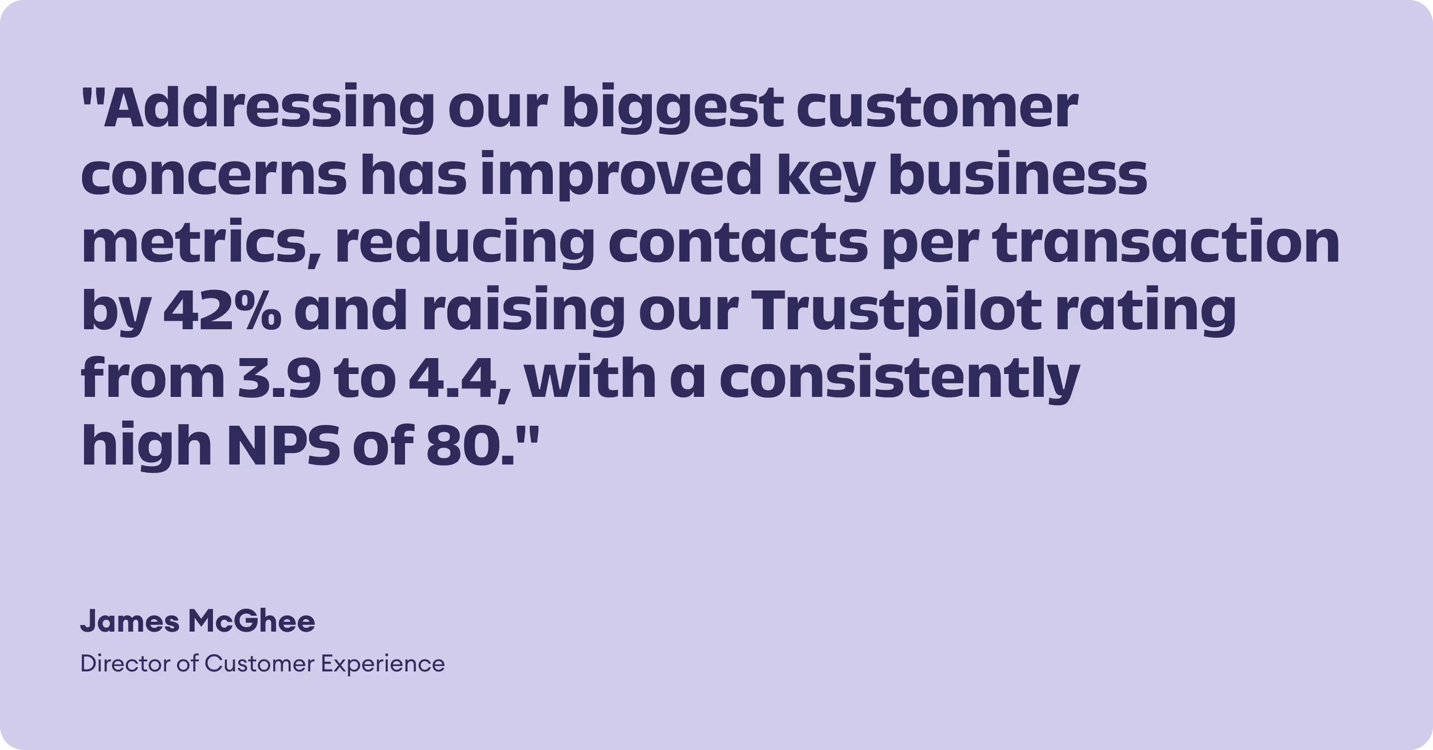 “Addressing our biggest customer concerns has not only restored trust but also significantly improved our key business metrics. We've reduced contacts per transaction by 42%, from 0.28 to 0.16. Our Trustpilot rating has risen from 3.9 to 4.4, leading to a notable increase in 5-star reviews. Today, we maintain a consistently high NPS of 80, ensuring exceptional customer experiences across all touchpoints. Chattermill has been instrumental in achieving these results and keeping us connected with our customers.”