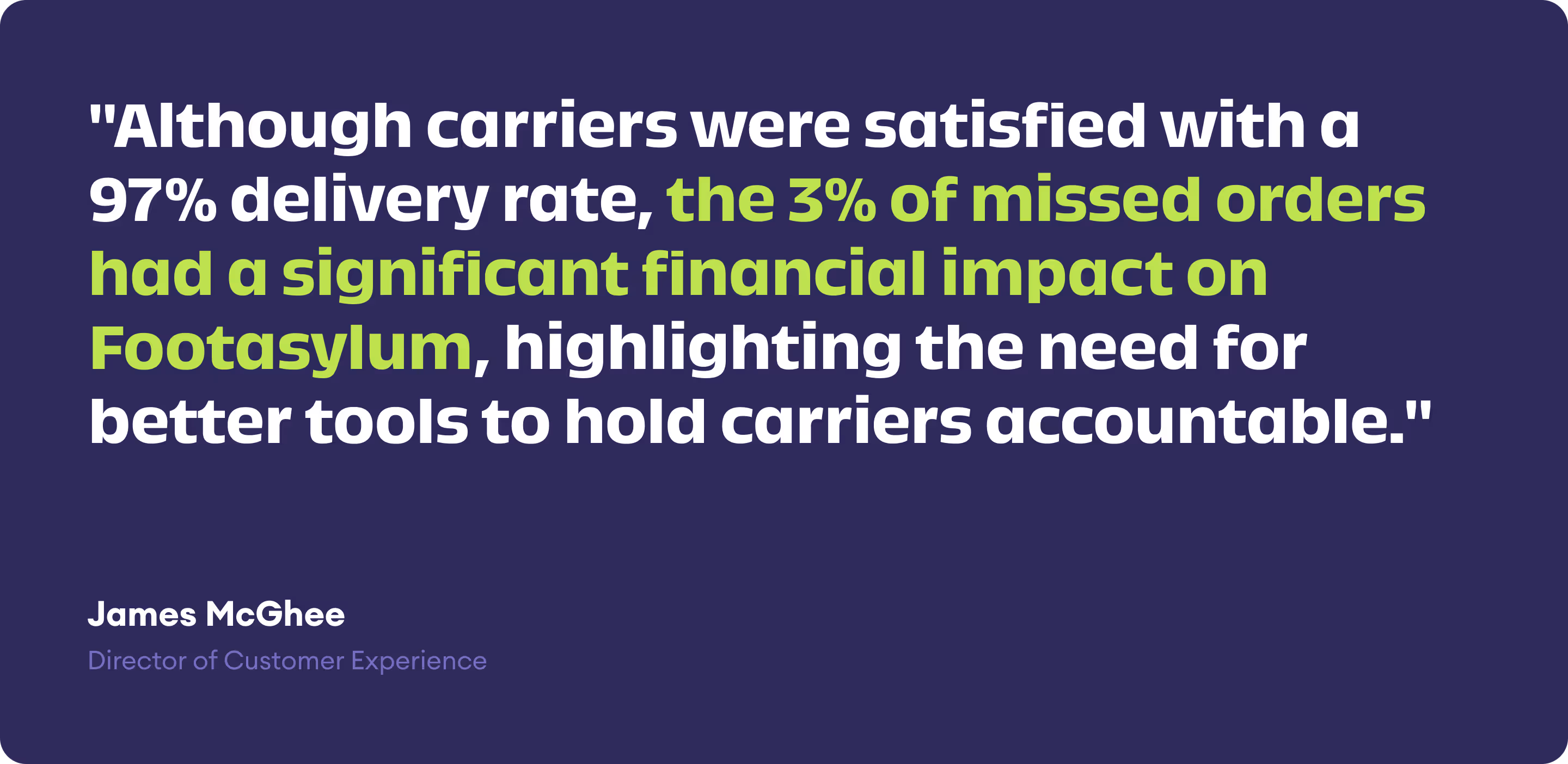 During the analysis, James observed that one carrier stood out because of its poor performance. This carrier's delivery shortcoming significantly impacted Footasylum's crucial 'deliver-to-promise' score, which tracked whether deliveries were made within the promised four business days.