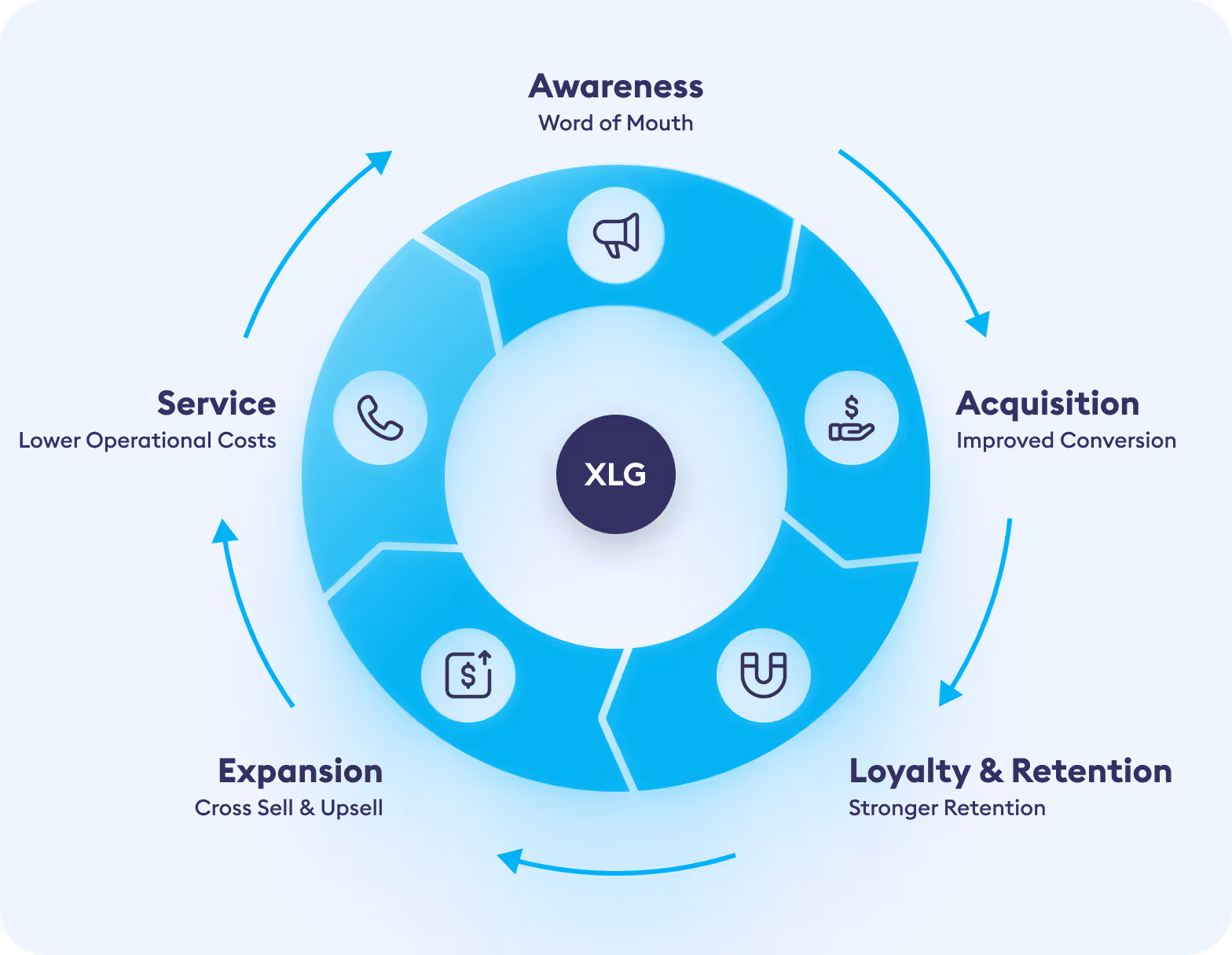 The XLG flywheel connects the customer acquisition lifecycle with the benefits it delivers to focus on how customer experience impacts business outcomes. When executed well, XLG drives higher profit across every step of the customer journey. It’s important to note that every company will have its own unique opportunities across the journey.