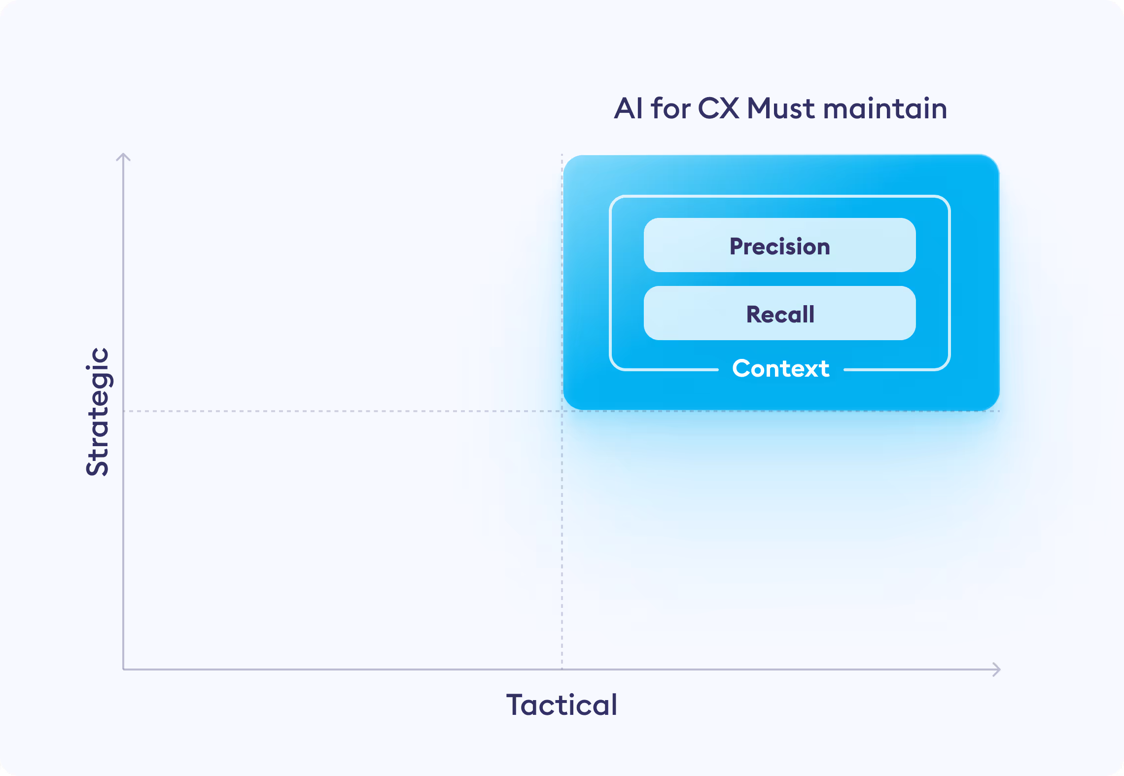 In order to support successful CX, your AI model needs to support precision, recall, and accuracy as it shifts from tactical to strategic analysis.