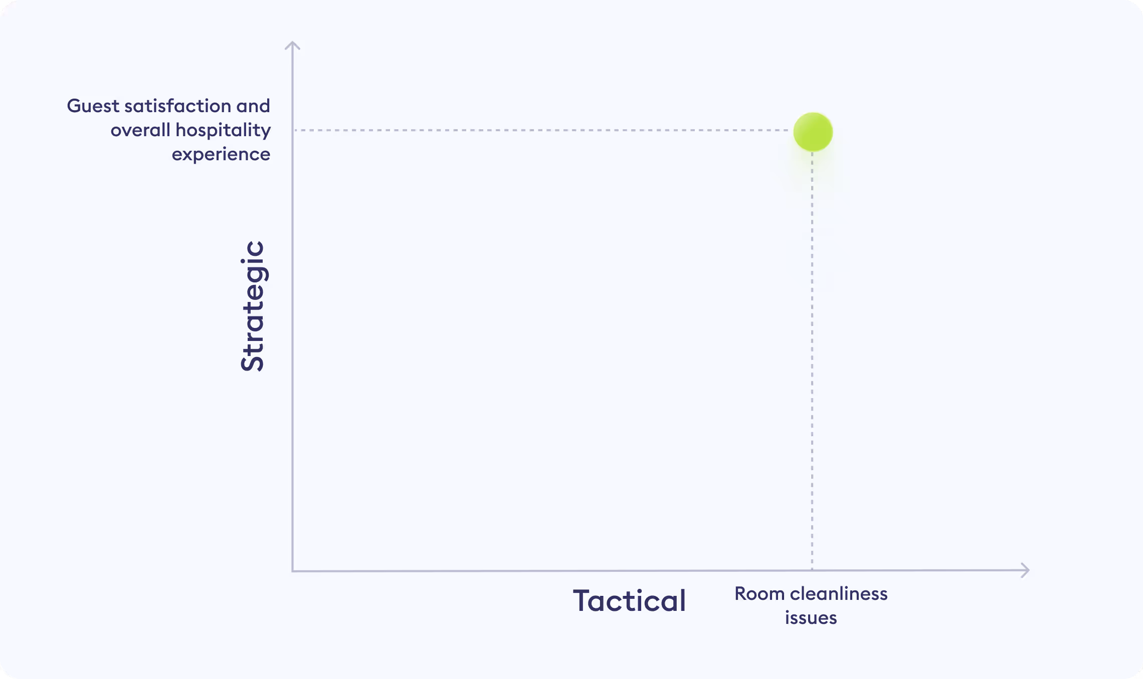 Why It Matters: A keyword-based approach can highlight specific cleanliness complaints, but it might miss the broader impact on guest satisfaction and their overall experience. Advanced AI can connect these cleanliness issues to broader themes like "hospitality," revealing how such issues influence guests' likelihood to return or recommend the hotel. This allows the management to prioritize housekeeping improvements as part of a strategic initiative to enhance guest satisfaction.