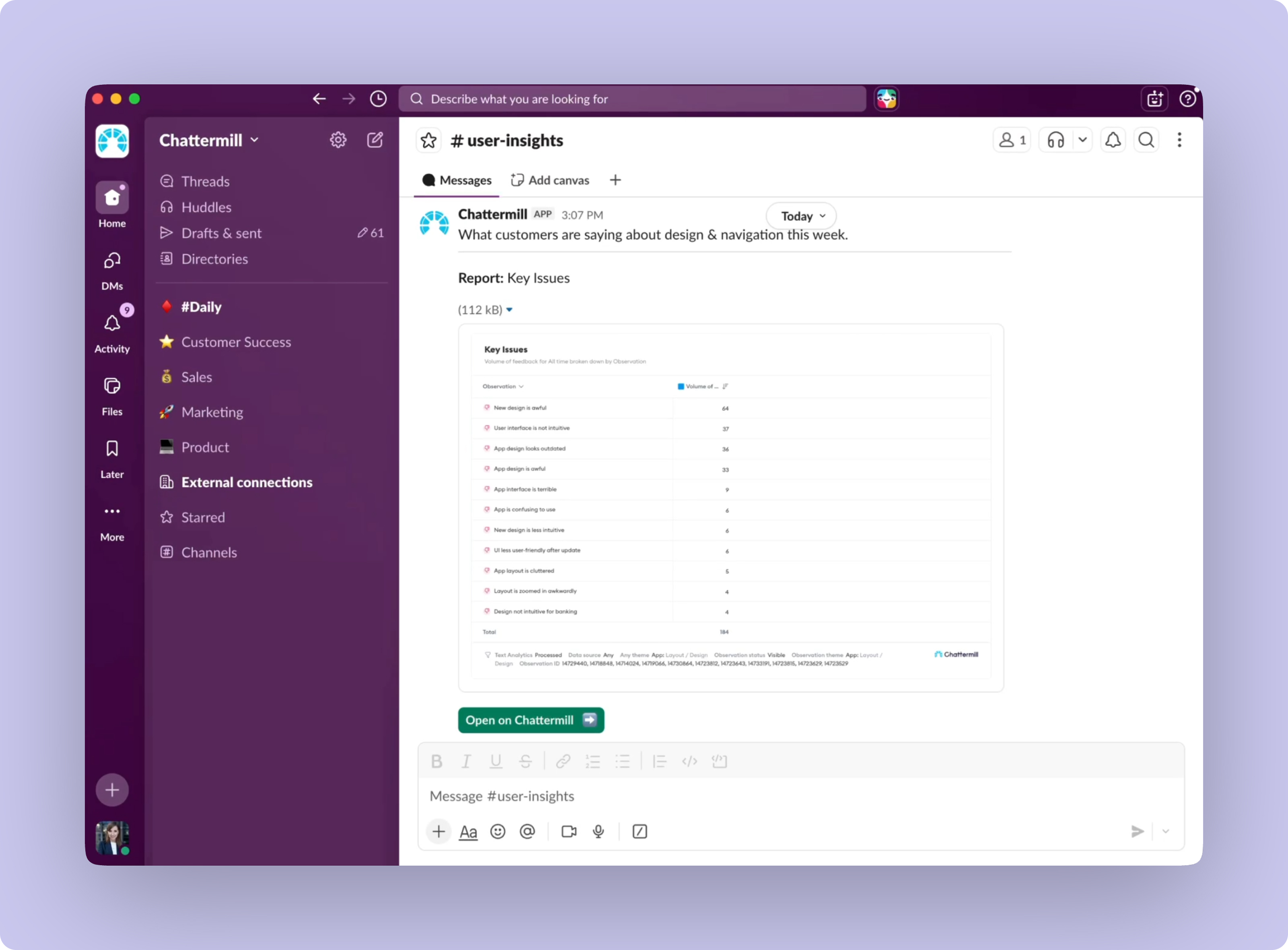 Connect Chattermill to Slack and bring customer insights to where decisions get made.
