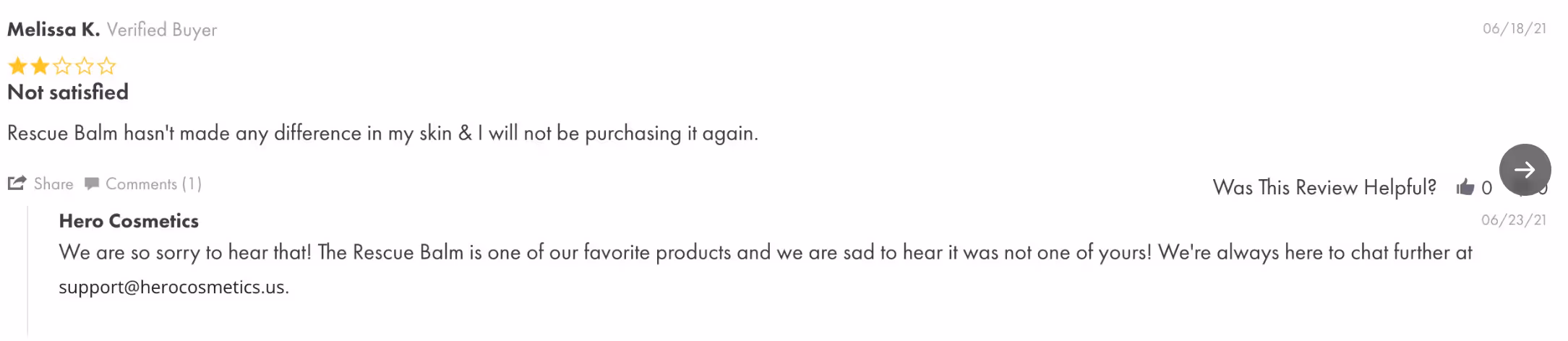 Hero Cosmetics has chosen to do so in a very public forum. Head to any of their product pages, and you’ll find their reviews easily visible. When these are negative, they’ll respond both with an apology and some advice on how best to use the product too.