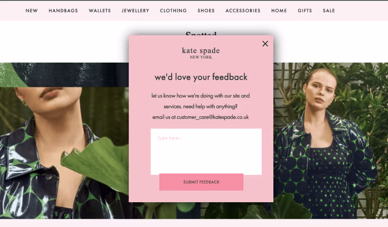 Taking a more direct approach to how their customers’ voice is heard, Kate Spade presents visitors to the website with a feedback window, encouraging them to submit suggestions they have about their website and services.