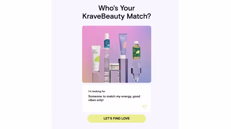 Krave Beauty takes this trend and adds a twist – their quiz is in the style of a dating app. You’re greeted with questions that are designed to find you the perfect match: “What kind of person are you at parties?” “What was your childhood TV crush?”.
